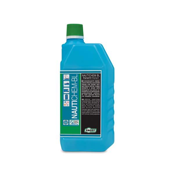 Disgregante per WC chimici, con azione antibatterica ed igienizzante, in flacone con speciale dosatore.